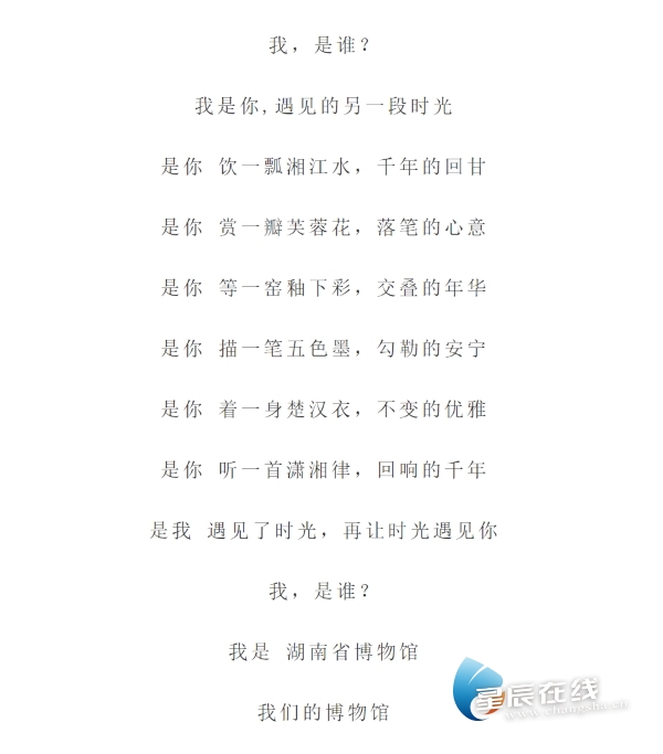 结束时首尾呼应,再次发问“我,是谁?”,“我是湖南省博物馆,我们的博物馆。”一问一答,简明扼要,既是对全篇的点睛总结,也将宣传片推向高潮。