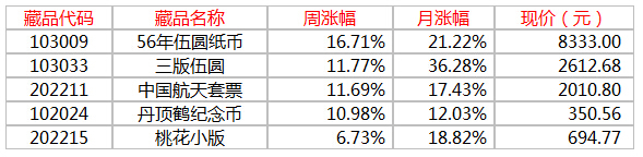 虽然电子盘整体表现疲软,但仍有一些藏品令人惊喜。股票市场有“弱势买妖股”的说法,邮币卡电子盘也藏着一些“妖品”耐人寻味。其中,南京文交所银币板块的创业板银币上周表现最为强势。从10月26日起,连续两个涨停以后,一直逆势上扬,一周上涨34.64%,月涨幅也达21.71%。