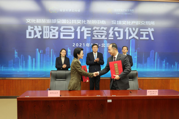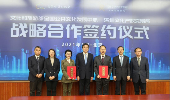 1月13日,文化和旅游部全国公共文化发展中心(以下简称“发展中心”)与深圳文化产权交易所(以下简称“深圳文交所”)在北京签署战略合作协议。合作双方将依托全国文化馆行业及人才队伍优势,深入发掘整合文化资源,开发全民艺术普及文化创意产品,提升文化馆(站)服务效能,深化公共文化服务供给侧改革,推动文化事业与文化产业融合发展。