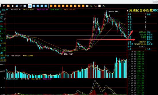 南方所今日开盘2047.12,最低2033.74,最高2057.25,收盘2043.76。全天下跌3.37点,跌幅0.16%,全天成交额11.1亿。分时图上今日总体震荡走势。K线图上面,今日走势体现出最近2040一线对行情有强支撑。并且近期震荡区间在收窄,后期会选择方向,笔者倾向于综合指数向上突破。 板块方面,退出流通人民币板块,近期连续三天收阴线,周二收出带长上影线的阴线,今日收盘跌破5,10日均线。且近期行情上涨出现量价背离的状况,后期注意该板块的风险。 流通纪念币板块,最近一直阴跌模式,没有出现有效反弹,今日最低触及1180.77,今年3.22号该板块创出一个阶段性高点1150.41。后期关注该板块是否会在这个位置形成有效支撑,从而带来一波反弹行情。 操作建议:关注流通纪念币板块是否在1150一线形成有效支撑,从而带来一波反弹行情。