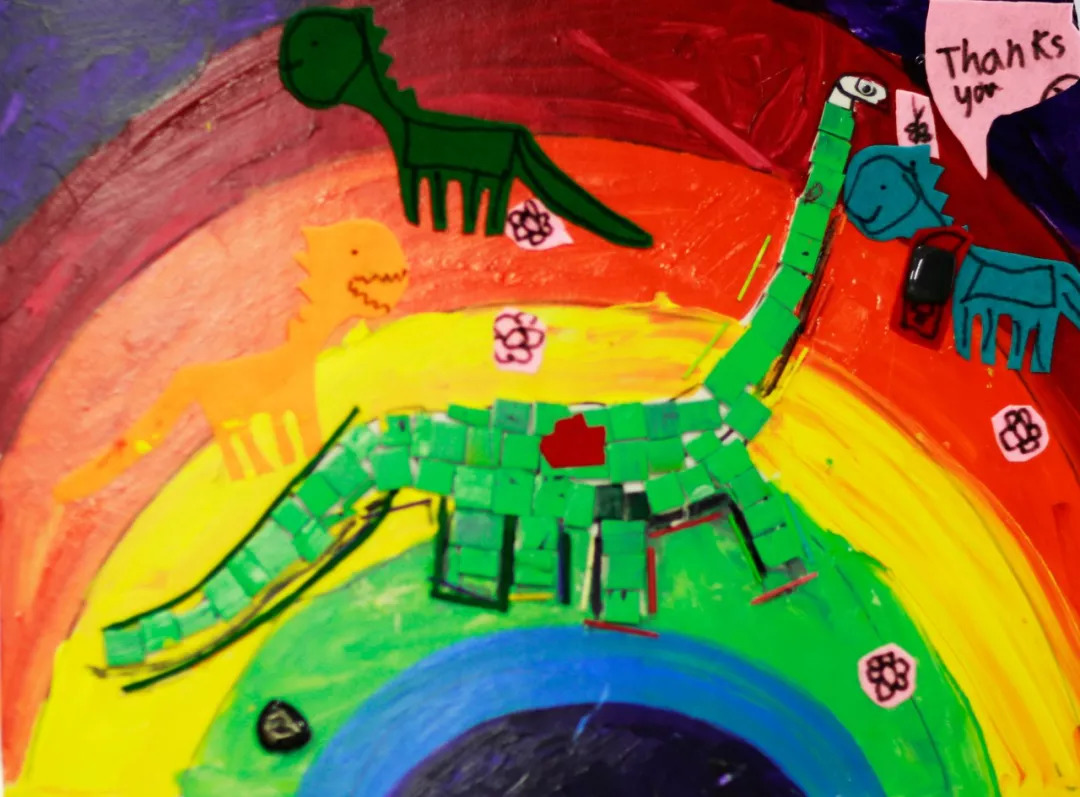 ▲天使国际艺术教育小艺术家 Isabella创作的《马赛克恐龙》