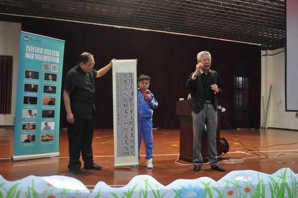 书法家郑轩先生在研讨会上讲解了书法历史、书法艺术中的结字、笔法、墨法、章法等,着重解读了启功先生的“黄金律结字法”,让与会代表耳目一新,受益匪浅。书法家孟繁禧先生重点讲授了临帖的基本方法,并对市实验小学10名小学生的书法作品逐一点评,点评中妙语连珠,把自己37年学习欧体字的体会和代表们交流,在点评中体现书法大家对书法的挚爱、对当前书法乱象的批评、对书法后继有人的期待,让小学生们第一次现场聆听到书法大家的指导,兴奋不已。两位书法家还现场泼墨挥毫,亲自示范,书法大师和学校师生的现场互动使会场的气氛达到高潮,同时,两位书法家在现场专门为市教育局和市实验小学题字。