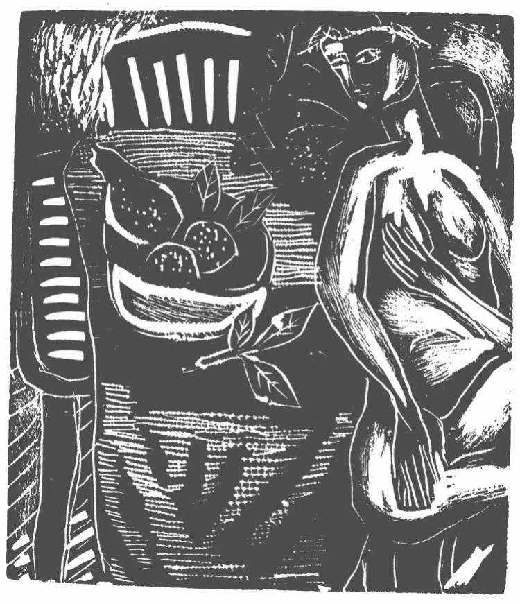 李桦《室内人物》黑白木刻,首刊于《现代版画》第一集