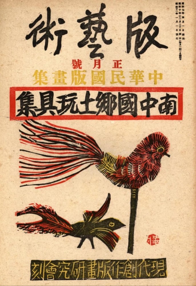 本次《白咬着黑——新兴木刻运动中的“现代版画会”馆藏作品展》还有两个小单元,即《现代版画》中的“民间风俗”与“乡土玩具集”。除了用木刻再现当时的民间风俗,现代版画会的成员还曾与日本木刻社团“白与黑社”合作出版了《南中国乡土玩具集》及《北中国乡土玩具集》,用套色木刻的手法记录了这些消逝已久的民间风趣。这两本画集亦在现场展出。