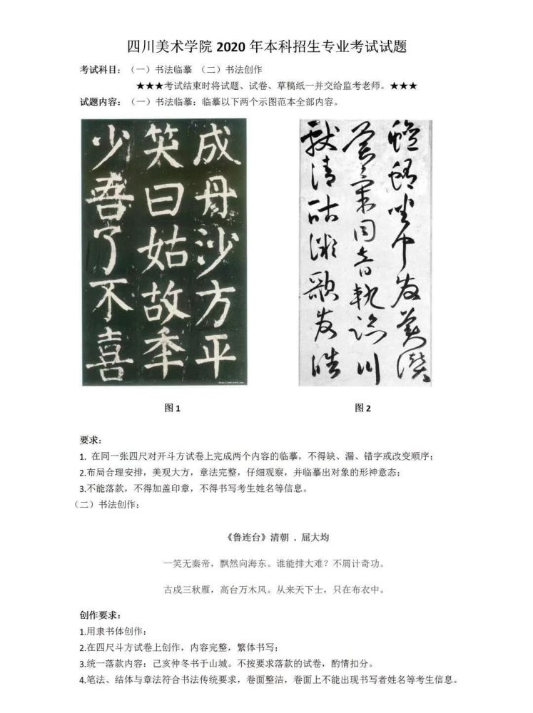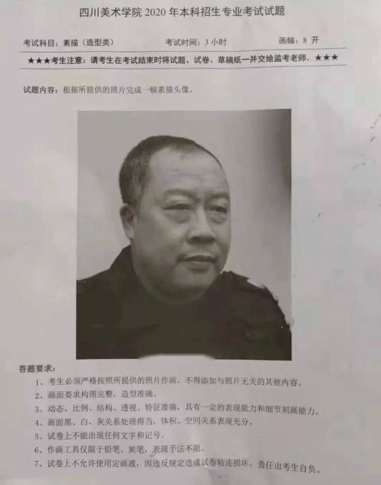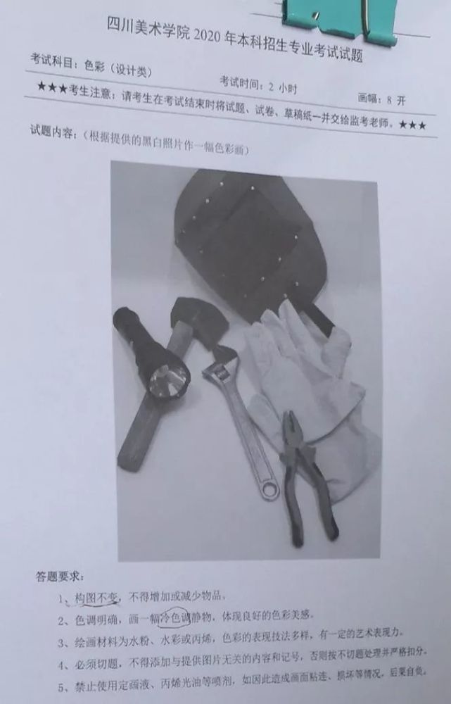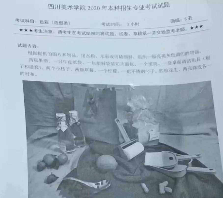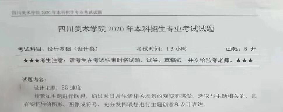 本文转自:美术生 8大美院校考 正式由川美打响了第一枪 1月5、6日四川美院 在贵州的考点正式开考 一般同一个学校在全国 各个考点的考题难度及 出题套路差别不会太大 所以已考完地区的考题非常有参考性 还未考的地区同学尽快参考针对考题备考 四川美术学院 贵州考点考题及范画 // 造型专业 素描 王麒老师考题范画 速写 考题:午夜时分,街上无行人,此时只有一家便利店正在营业,以此描绘一幅便利店生活场景 色彩 考题:两瓶果酒,一只牛皮纸袋,一包塑料袋装切片面包,一套桌面清洁用具(刷子和撮箕),两个小橘子,两颗草莓,一个柠檬,一把不锈钢勺子,四粒花生,两张深浅各一的衬布 微博:@艺叔龙刚 // 设计专业 素描 (考题暂无) 色彩 考题:根据黑白照片创作一幅彩色画, 静物为一幅面罩、一只锤子、一个手电筒、一把扳手、一只钳子、一副手套 要求构图不变,画一幅冷色调静物。 设计基础 设计考题主题:5G速度 // 书法专业