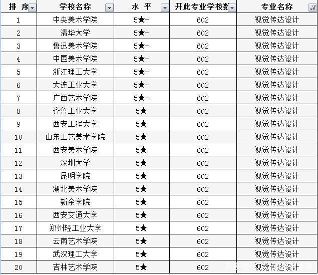 视觉传达设计专业排行榜上中央美术学院排名首位,其后依次为清华大学美术学院、鲁迅美术学院、中国美术学院、浙江理工大学、大连工业大学和广西艺术学院等7所高校该专业等级评定为五星级+,而后有齐鲁工业大学、西安工程大学、山东工艺美术学院、西安美院、深圳大学、湖北美院、云南艺术学院、吉林艺术学院等13所高校视觉传达设计专业达到了五星级水平。
