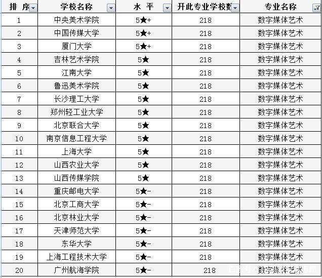 数字媒体艺术专业五星级+等级的高校为中央美术学院、中国传媒大学和厦门大学。而在五星级等级内有吉林艺术学院、江南大学、鲁迅美院占有重要地位,也是处于前六之位。而该专业中重庆的重庆邮电大学、湖南的长沙理工大学比较突出。