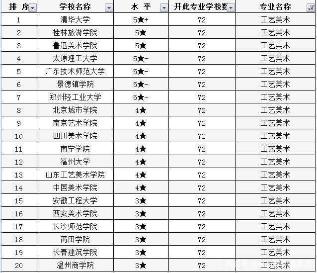 在工艺美术专业中只有清华大学美院获得了五星级+的评级,而五星级高校也只有桂林旅游学院与鲁迅美术学院位列其中,五星级-等级内有太原理工大学、广东技术师范大学、景德镇学院、郑州轻工业大学等4所高校。南京艺术学院、四川美术学院、山东工艺美院和中国美院只获得了四星级评分,西安美院进入三星级阵列。