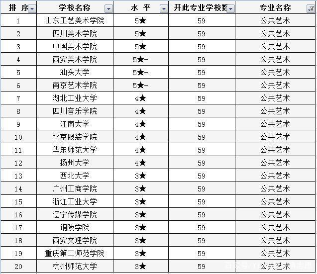 公共艺术专业排名前五的高校有山东工艺美术学院、四川美术学院、中国美术学院、西安美术学院和汕头大学。西南地区另外还有四川音乐学院、重庆第二师范学院两所高校进入前20名。