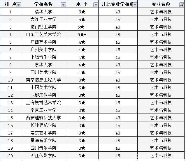 艺术与科技专业排名前五的高校有清华大学美院、大连工业大学、厦门理工学院、山东工艺美术学院和广西艺术学院。另外如广州美院、东华大学、四川美院、中国美院、上海视觉艺术学院、成都东软学院、长沙师范学院、南京艺术学院、四川音乐学院、浙江传媒学院等都进入艺术与科技前20强。