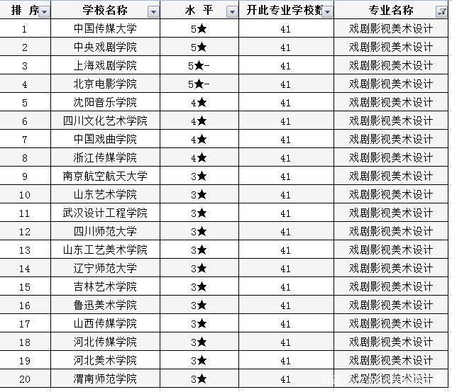 戏剧影视美术设计专业其实是属于戏剧影视类专业,不属于美术类,但该专业只能招收美术类学生而列入本文。排名前五的高校为中国传媒大学、中央戏剧学院、上海戏剧学院、北京电影学院和沈阳音乐学院。其中比较特别的是南京航空航天大学的突出实属美术类男生的福音。