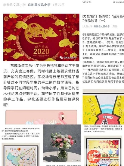 老师们积极整合优秀的美术课程资源,分年级、分学段,充分考虑学生年龄特点,巧妙与当前疫情防控相结合,指导学生在手工制作、绘画、手抄报制作等方面开发课程资源,借助文昌小学公众号推送,及时分享给宅家的文昌少年。