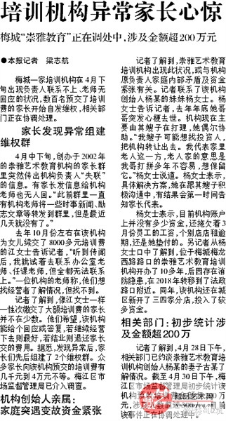 据了解,因资金紧张及机构内部矛盾等多种原因,崇雅艺术教育培训机构经营出现异常,政府相关部门已介入调查、协商、调解。但该机构账上已无资金,确定无法继续经营。记者获悉,该事件涉及学员人数有两千多名,拖欠课时学费价值金额不低于1000万元。目前,已有不少家长通过法律途径去维护自己的合法权益。“我希望同行机构能帮忙分流学员,让他们能够继续上课。”崇雅艺术教育培训机构创始人杨某遗孀古女士向记者说道。