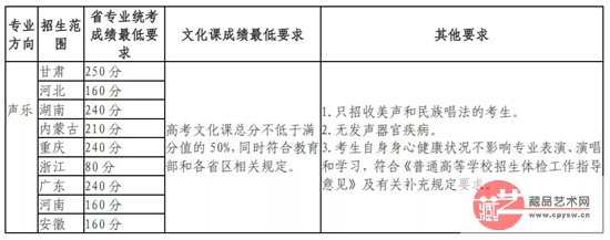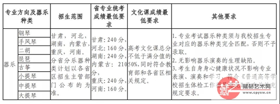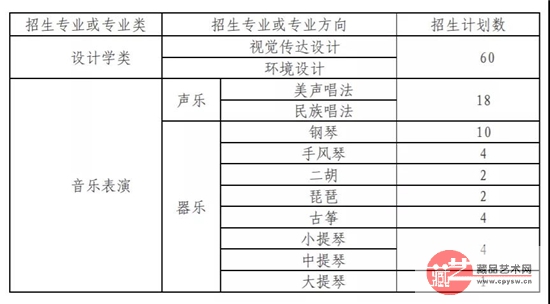 音乐表演:含声乐方向和器乐方向,共计45名。声乐方向只招收美声唱法和民族唱法学生,共计18名。器乐方向招收乐器种类为钢琴、手风琴、小提琴、中提琴、大提琴、二胡、琵琶、古筝的学生,共计27名。