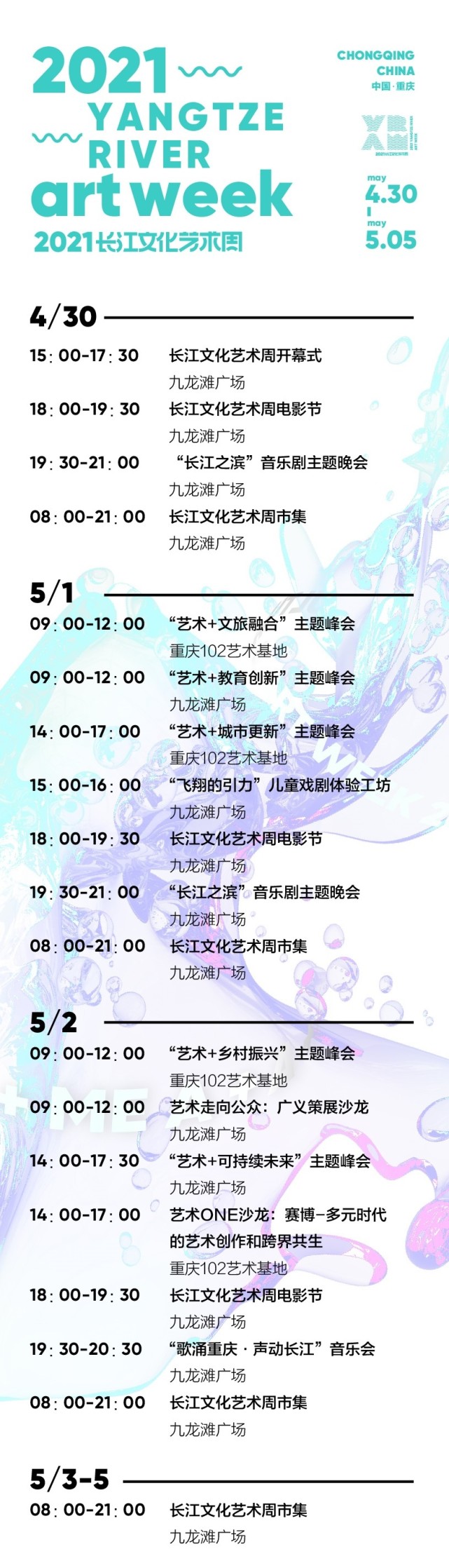 2021年长江文化艺术周开幕式将于4月30日在九龙滩广场举行,以“艺术+”为主题,聚焦长江文化艺术湾区建设,助力打造重庆城市新名片。
