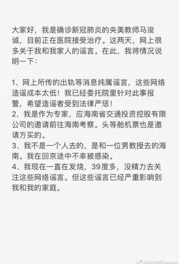 近日,作为北京新增新冠肺炎确诊病例,中央美术学院教师马浚诚受到关注。网传聊天截图称,返程回京后被确诊的马浚诚,是和老婆的闺蜜前往海南,该传言在网上广泛传播。8月5日,马浚诚发文辟谣称:自己是应海南省某公司邀请前往海南考察,而且是和另外一位男教授同行,目前已委托单位报警,希望造谣者受到法律严惩。