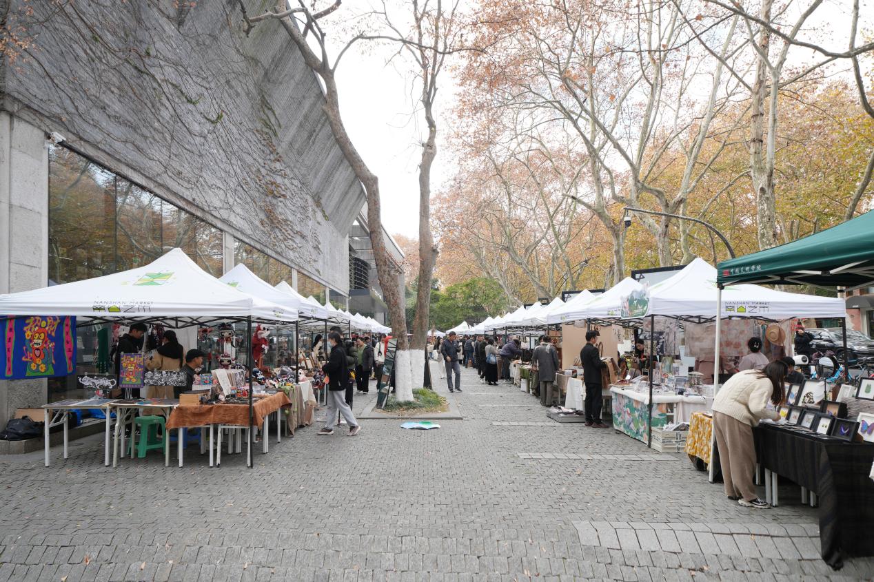 除了大型的秋叶艺术装置之外,此次大学生创意生活节还同步在杭州南山路开设“南山艺市”,展出了琳琅满目的青年创意作品。在创意集市上,市民游客不仅可以淘到自己喜欢的书画作品,还可以沉浸于手作的快乐,体验古法花草灯和果木风铃的制作工艺、干花书签等活动。“现在各个地方市集很多,但我更喜欢这个创意市集,我还买到了一幅很喜欢的画。”住在荷花池头的居民李先生说。