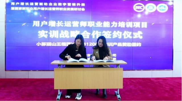 会议上,你好小豚(北京)科技有限公司和用户增长运营师职业能力培训项目联合建设运营单位北京七彩未来网络科技有限公司签订了实训战略合作协议,将由你好小豚(北京)科技有限公司为第一批1万名用户增长运营师职业能力培训学员每人赞助1200元的小豚猫山王榴莲冰淇淋实训产品。你好小豚(北京)科技有限公司合伙人商玲表示,公司将持续以此助力学员们学到真本领、得到真收益,公司也将努力“增品种、提品质、创品牌”,通过与用户增长运营师职业能力培训项目战略合作,助力企业数字营销升级发展,打造“榴莲+”特色产业。