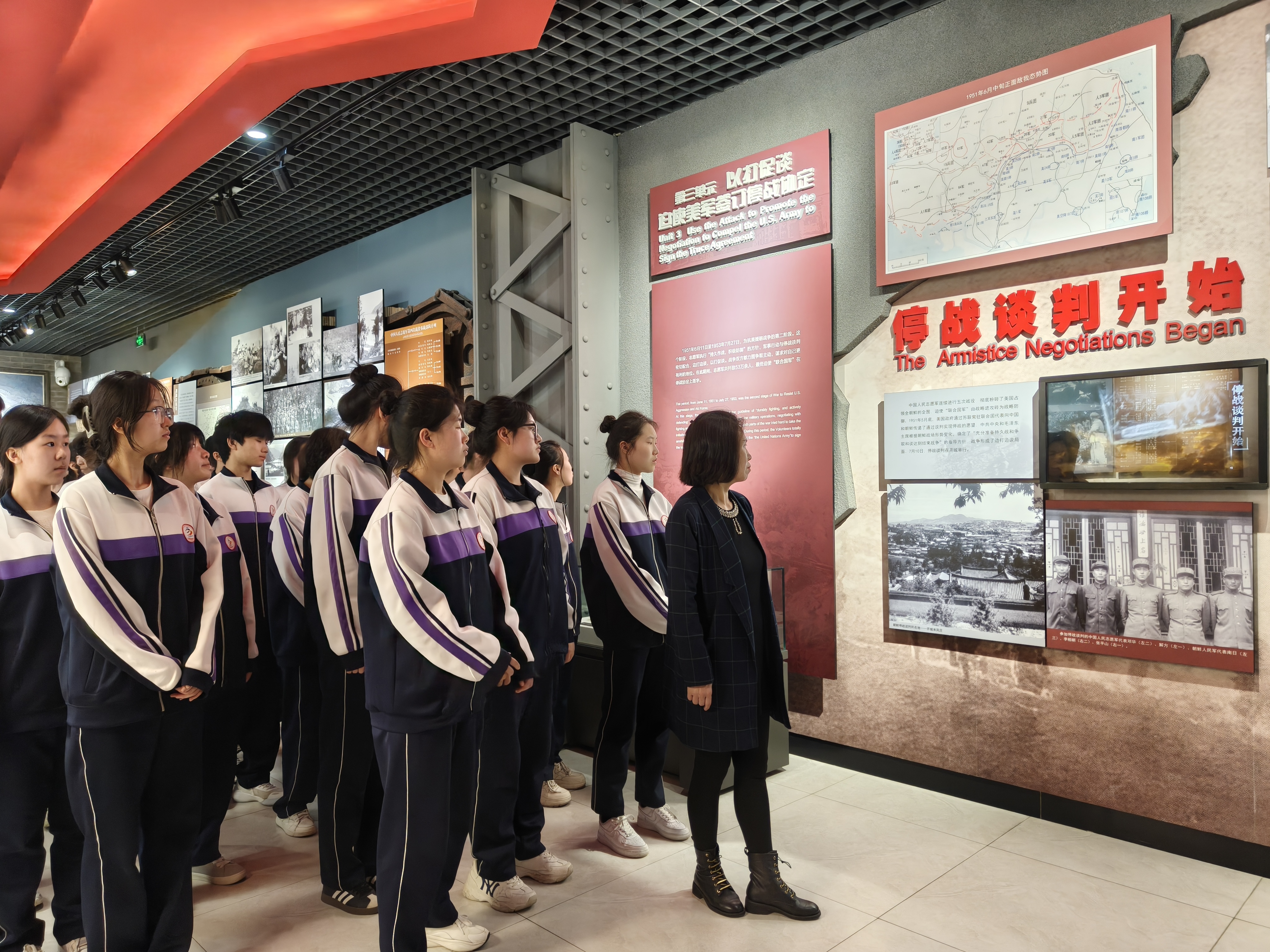 全体师生在讲解员的带领下,瞻仰纪念馆内420多幅珍贵的历史图片,驻足在烈士生前使用过的武器、荣获的勋章等遗物前,听着抗美援朝战争中关于勇气、智慧、牺牲的故事,仿佛自己也来到了战场上,与英雄们并肩作战,共同书写保家卫国的远大理想。