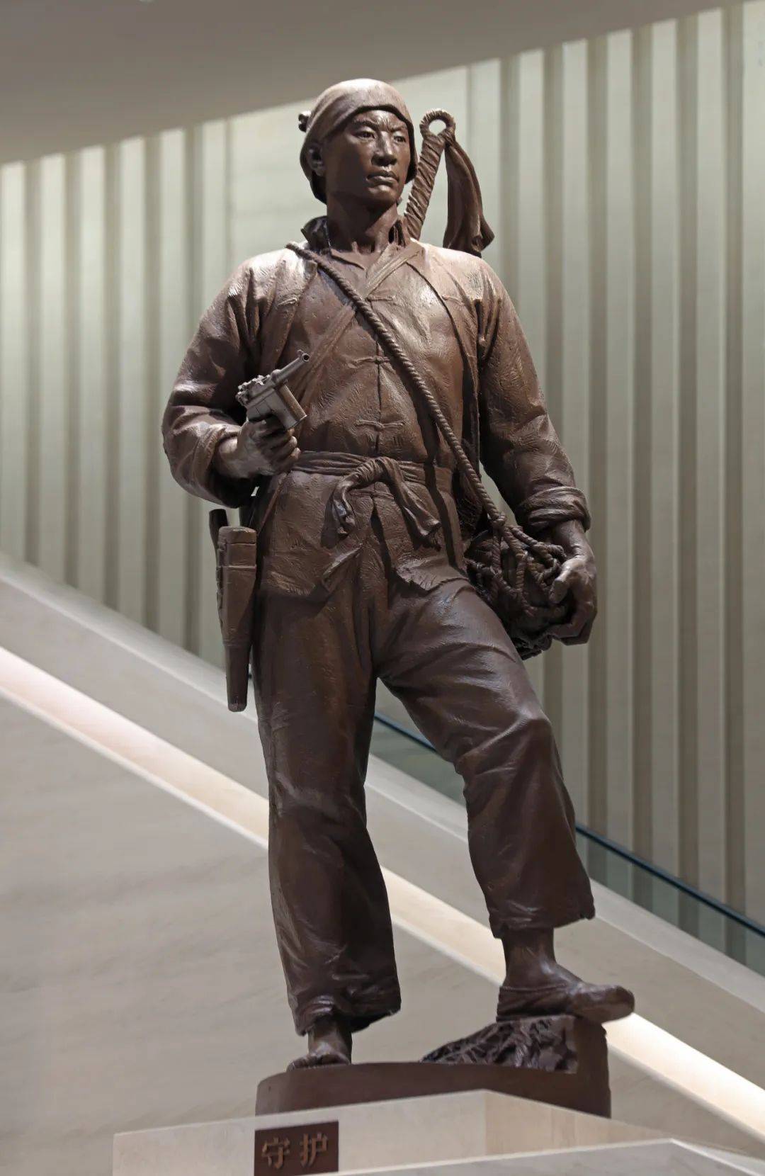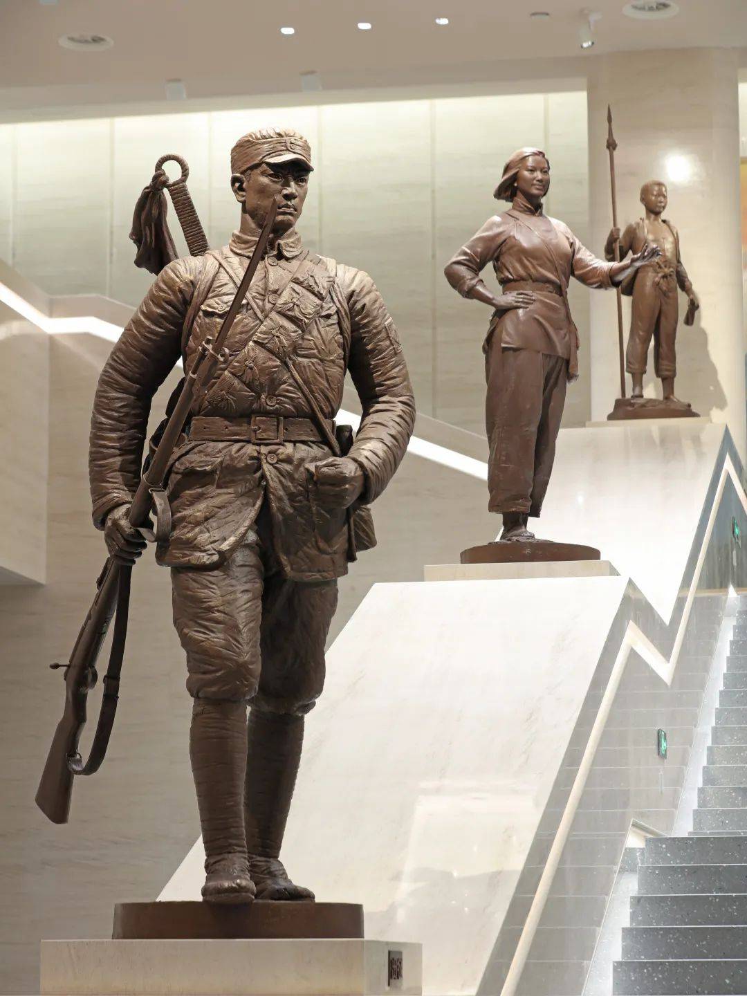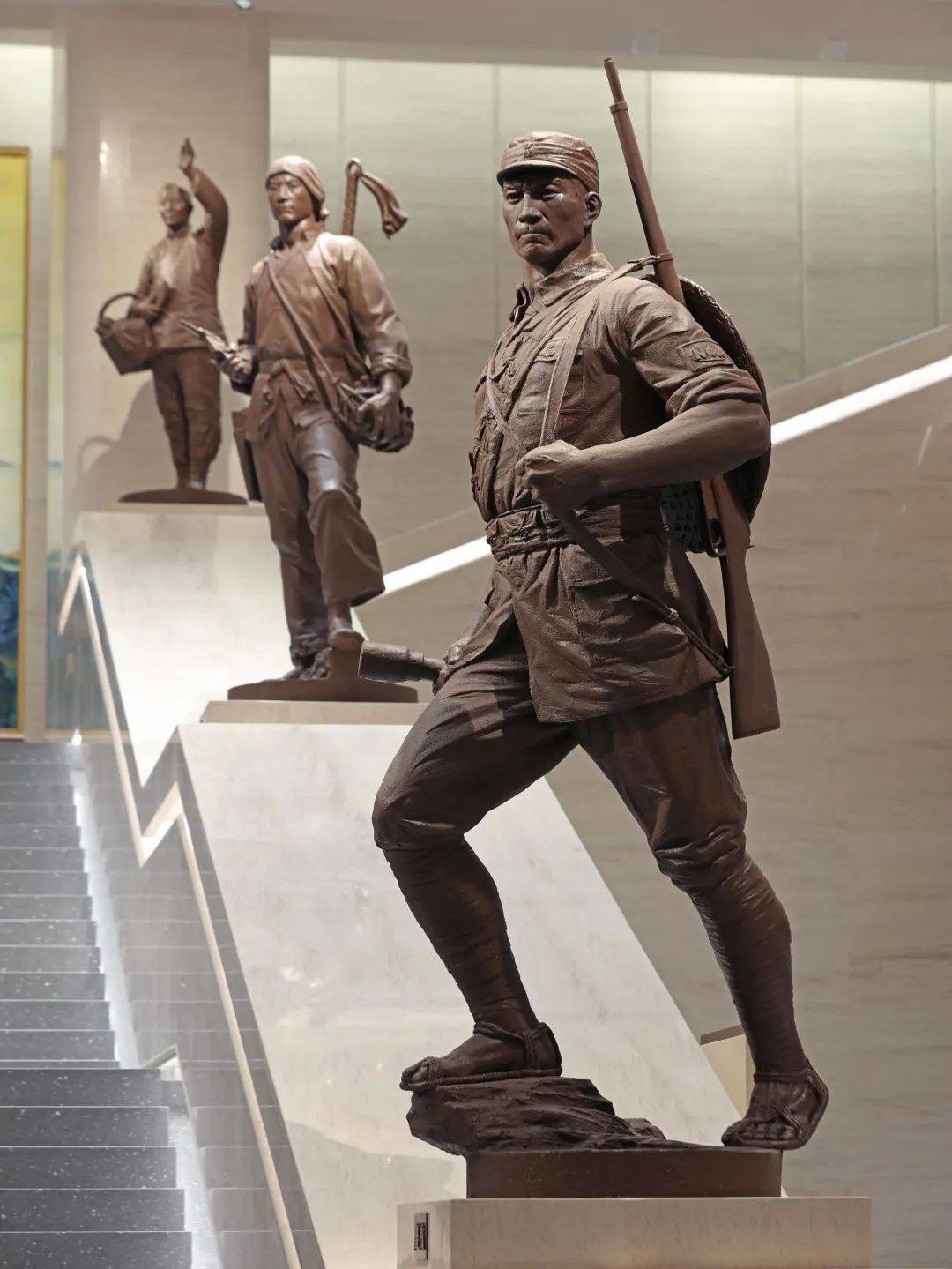 组雕位于中国人民抗日战争纪念馆新建的礼仪性空间“中厅”,中央礼仪阶梯9.3米的宽度与9.3米的空间净高是对“9.3”抗战胜利日这一具有纪念意义数字的双重隐喻,位于两侧扶手上矗立着六座圆雕,分别为《出征》、《鏖战》、《守护》、《发动》、《盼归》、《放哨》,组雕人物姿态各异但视线均自然导向地下展厅,在起到空间引导功能的同时,还在历史真实性与艺术表现力之间构建起多维度的记忆空间。当观众穿行其间,不仅能感受历史纵深中每个群体的独特贡献,更能在多重镜像的反射中,看见自己与民族命运的血脉联结——这正是对抗战精神最富生命力的传承。