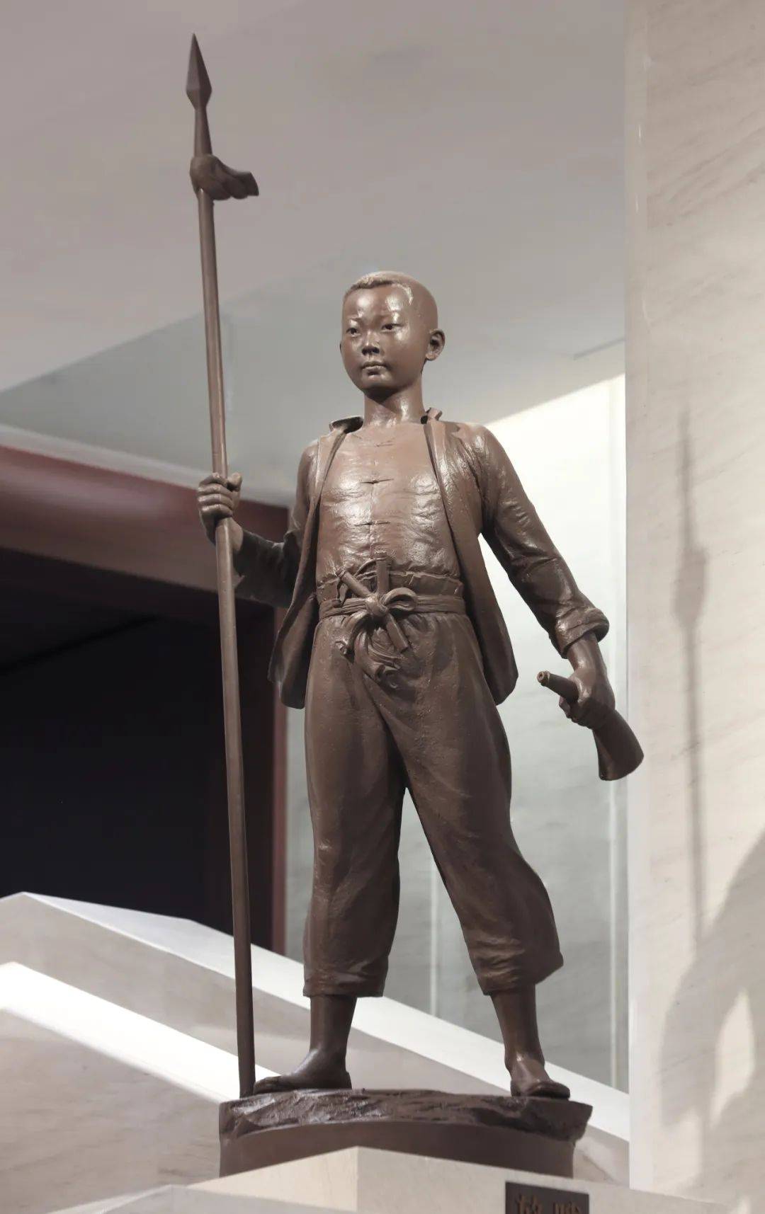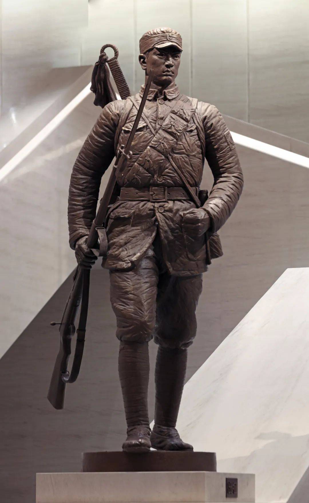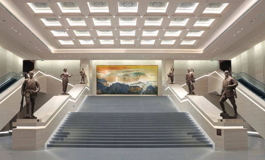 组雕位于中国人民抗日战争纪念馆新建的礼仪性空间“中厅”,中央礼仪阶梯9.3米的宽度与9.3米的空间净高是对“9.3”抗战胜利日这一具有纪念意义数字的双重隐喻,位于两侧扶手上矗立着六座圆雕,分别为《出征》、《鏖战》、《守护》、《发动》、《盼归》、《放哨》,组雕人物姿态各异但视线均自然导向地下展厅,在起到空间引导功能的同时,还在历史真实性与艺术表现力之间构建起多维度的记忆空间。当观众穿行其间,不仅能感受历史纵深中每个群体的独特贡献,更能在多重镜像的反射中,看见自己与民族命运的血脉联结——这正是对抗战精神最富生命力的传承。