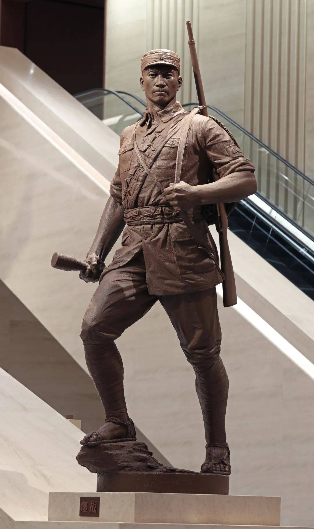 服饰:身着正规新四军单衣军装,背斗笠,脚踏砖石呈前倾姿态,草鞋,左手紧握枪带,背扛汉阳造,右手紧握手榴弹,肩背子弹袋,随时准备进入战斗状态。