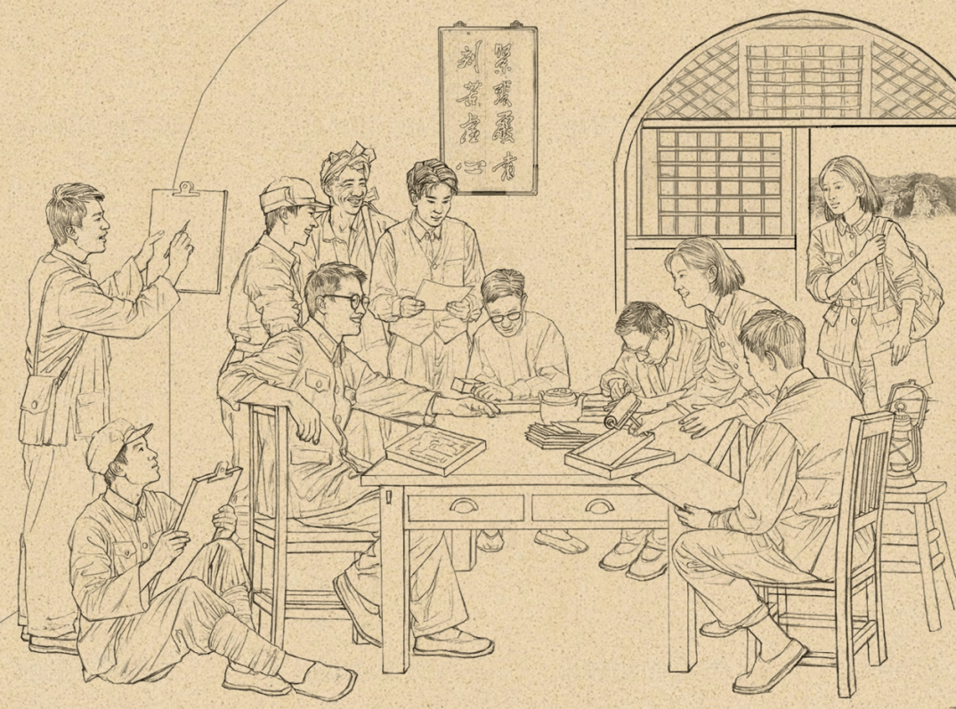 作品选取抗战时期延安鲁艺美术组制作木刻版画的场景,生动地描绘了抗战时期文艺工作者在窑洞中积极热烈的探讨与创作,展现乐观的革命主义精神,墙壁上题写鲁艺八字校训:“紧张、严肃、刻苦、虚心”,这是毛泽东主席对鲁艺建立革命的艺术教育作风的重要指示。