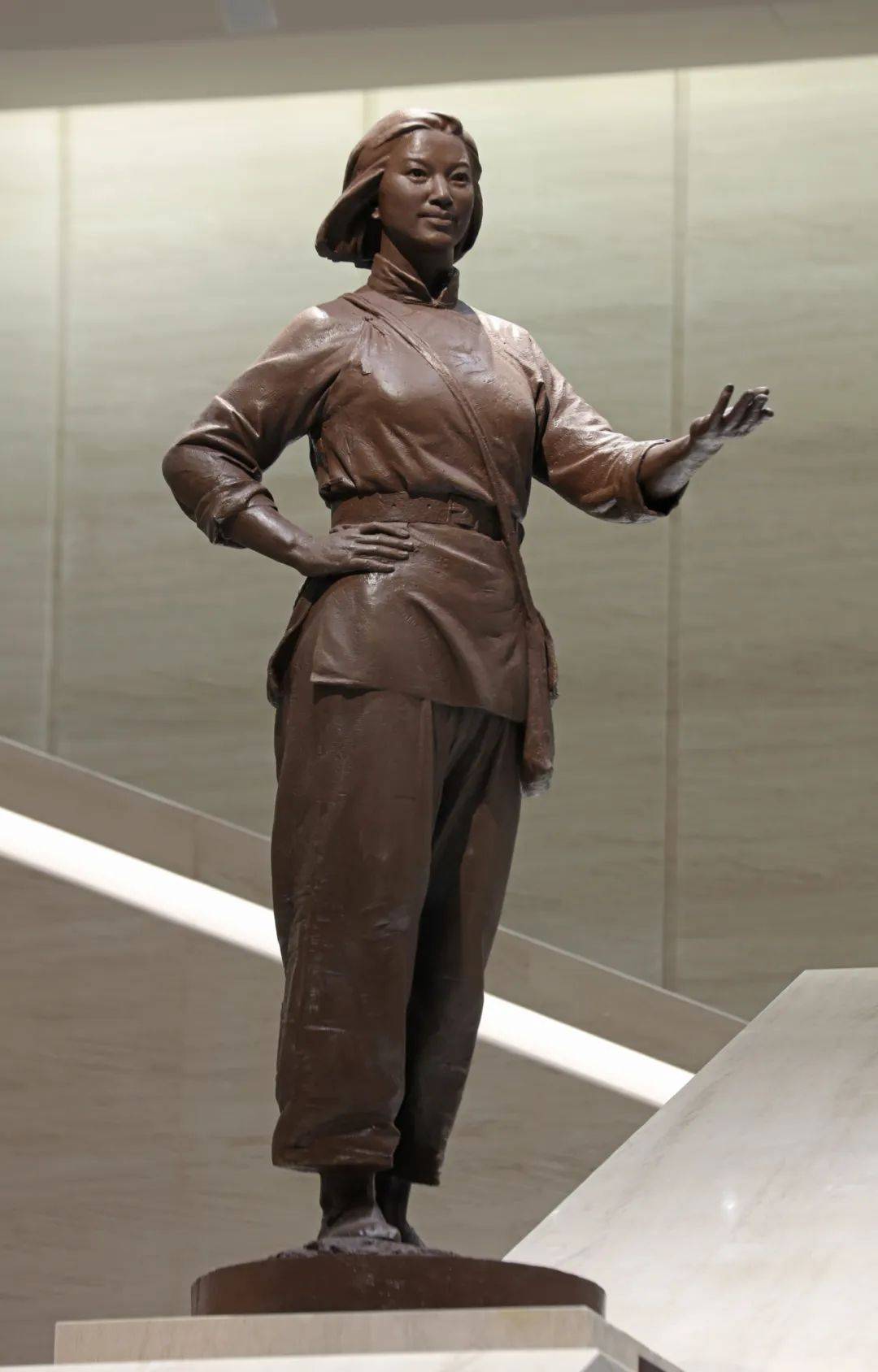 定妆形态:昂首挺胸,英姿勃发,右手自然叉于腰间,左手向前伸出,彰显出妇女干部的责任担当与使命意识。