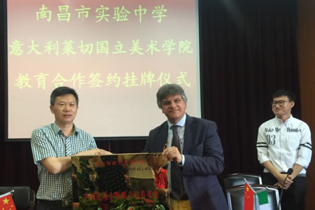南昌市实验中学是全国艺术教育先进单位、江西省重点中学,多年来全面培育“美在实验,和而不同”的校园文化,积极推进普通高中艺术特色发展试验,特别是黄凌云校长上任以来,积极引进国外先进艺术教育理念,为使南昌市实验中学艺术教育努力走出国门,积极推动艺术教育国际化,力争使学校成为江西省国际教育的示范学校。2014年至今,南昌市实验中学先后成为佛罗伦萨美术学院、阿德利亚音乐学院等意大利艺术名校“优质生源基地”,学校举行了一系列美术、钢琴、声乐等专业的意大利艺术大师课,积极吸纳意大利艺术教育先进理念,受到意大利诸多艺术院校的高度认可及支持。2015年初,该校与国内小语种教育领导品牌北京泓钰学校合作,共设意大利国立美术音乐艺术院校艺术预科班,为广大学生开辟了更广泛的升学成才渠道,不断探索应试教育与素质教育有机融合,探索“中西合璧”的教学模式,为培养具有国际化教育理念的优秀人才探索出一种全新的培育模式,拓展了现代教育的内涵。今天该校与莱切美术学院的艺术教育合作协议的达成,标志着南昌市实验中学在艺术教育国际化进程中又迈出了坚实一步。