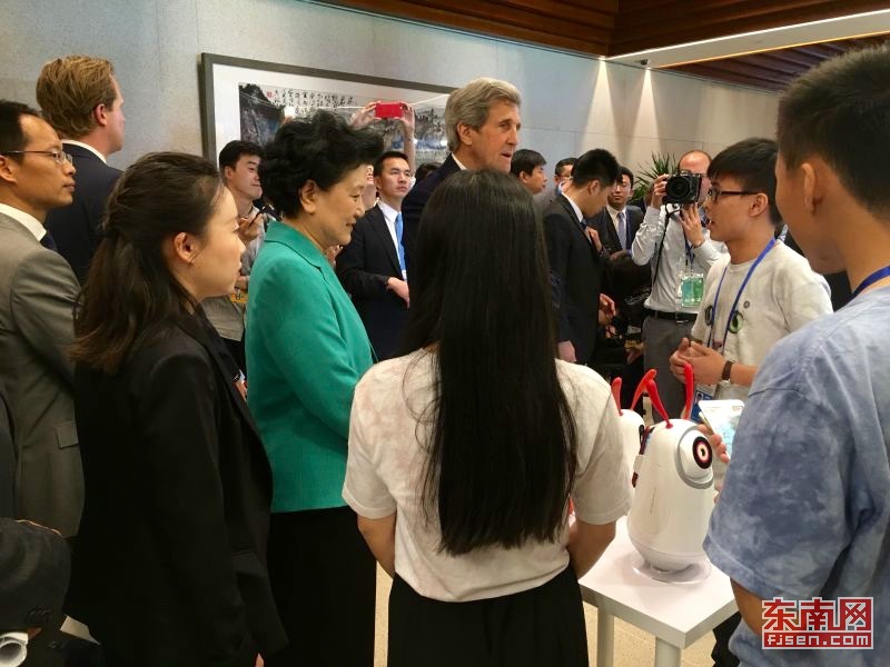 国务院副总理刘延东、美国国务卿约翰•克里观看“宠物自拍器”演示。 东南网6月8日讯(本网记者 张立庆 通讯员 游荻菲)日前,作为第七轮中美人文交流高层磋商配套活动,“中美青年创客大赛优秀作品展”在中国国家博物馆举行。国务院副总理刘延东、美国国务卿约翰•克里参观展演,并与中美青年创客亲切交流。 福州大学厦门工艺美院创新研究型拔尖人才培养实验班的胡瑾同学带领团队设计的“宠物自拍器”,以其突破性的创意和精致灵动的造型,在展览上受到了中美两国领导人的关注。在团队介绍并演示作品的过程中,美国国务卿克里还用自拍器玩起了自拍,并连连赞叹“太有创意了”、“令人印象深刻”。
