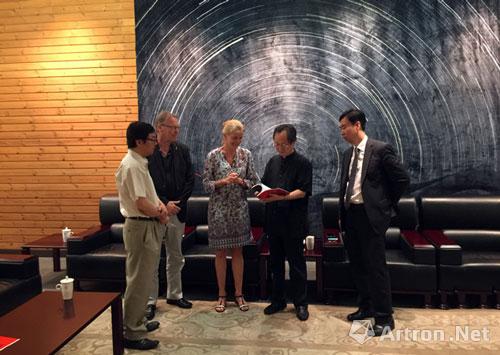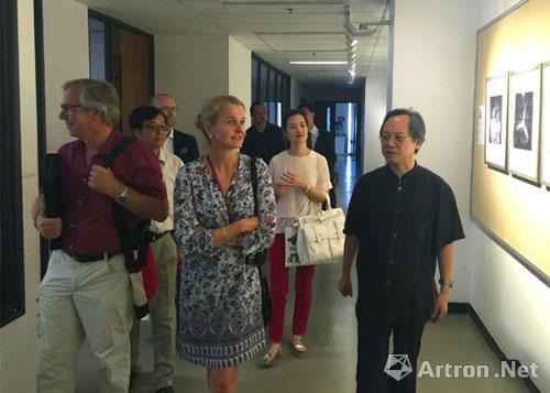中外来宾座谈 2016年7月13日上午,德国徕卡学院院长乌多策尔(Udo Zell)、徕卡画廊总经理卡琳·雷恩-考夫曼(Karin Rehn-kaufmann)以及德国贝尔艺术中心负责人等一行8人访问清华大学美术学院,清华大学美术学院院长鲁晓波、国际合作与交流办公室主任臧迎春、信息艺术设计系主任徐迎庆、信息艺术设计系教师冯建国教授、邓岩等在贵宾接待室会见了来宾。 德国徕卡学院来宾向清华美院院长鲁晓波赠送摄影家作品集 左5:徕卡学院院长乌多策尔 左6:徕卡画廊总经理卡琳·雷恩-考夫曼 右5:清华美院院长鲁晓波 德国徕卡学院院长一行参观清华大学美术学院