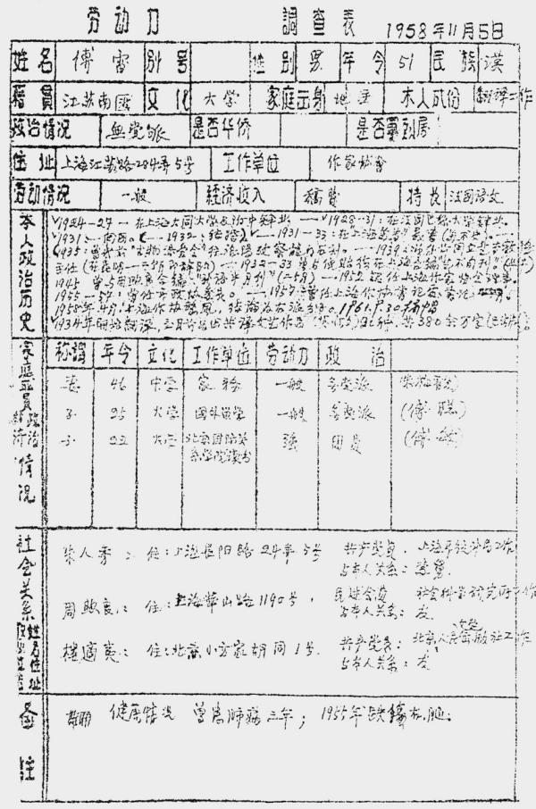 叶永烈收藏的傅雷档案——“劳动力调查”表格