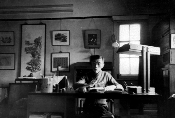 傅雷在江苏路寓所的书桌前,身后墙上悬挂着画作、书法等。