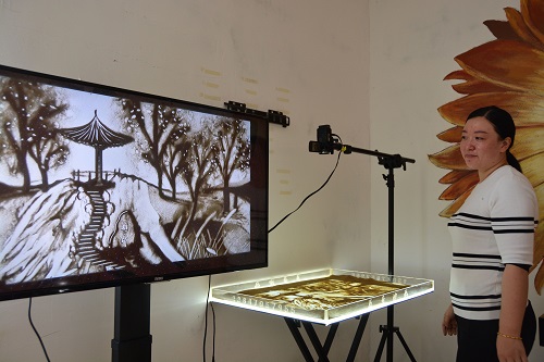 颗颗细沙从指间流出,通过技艺加工,成就美丽的图画,如今,张欣已走向成熟,她正在用自己的心智和汗水为扎兰屯市这片热土培养新兴艺术人才,也为扎兰屯市打造文化大市添加风采,她坚定自己的信念,就会离美景越来越近,向沙画艺术的新高地迈进!(记者纪明国)