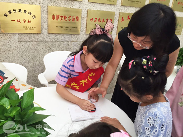 中国教育在线浙江站讯 (记者 陈显婷)今天上午,杭州市大关小学迎来了一年级的新生小朋友。简单的开学典礼过后,小伢儿们兴高采烈的拿着一个小本本,排队等着做什么呢。
