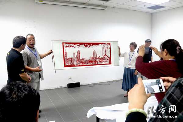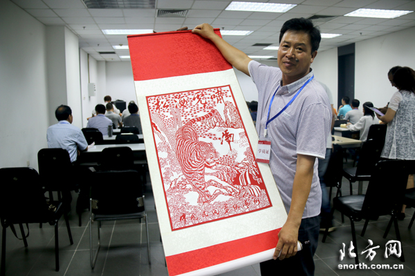 剪纸作品培训班开始前展示 天津北方网讯:9月12日上午,“中国非物质文化遗产传承人群研修研习培训计划”天津美术学院第二期普及培训班(剪纸艺术)正式开班。来自天津各区县和河北省蔚县的剪纸非遗传承人群、学员纷纷带着剪纸作品和美院老师们亲切交流,学习非遗文化知识,从而促进剪纸艺术走进现代生活,促进现代设计融入传统剪纸工艺。