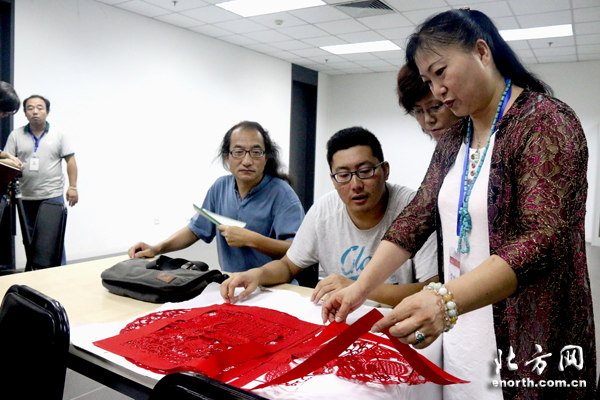 非遗文化传承人群讨论剪纸技艺 天津美术学院副院长郭振山说:“天津的剪纸艺术列为天津民间四大艺术之一,我们作为百年历史名校,将通过培训,使非遗传承人群在高等院校获得相对系统、扎实的美术理论和知识技能,便于他们回到工作岗位后更好的开展剪纸民间艺术创造。”