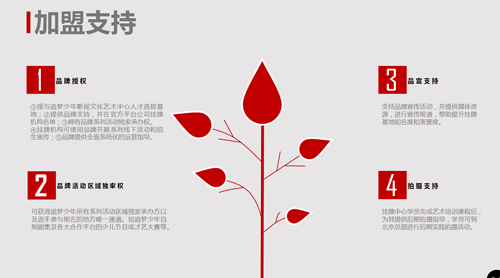 追梦少年选拔基地挂牌运营模式将采用:“一个中心N个基本点的方式”以北京为中心,辐射全国34个省,333个地级市,2862个县。追梦少年总部设在北京,主要负责对全国教育加盟基地进行品牌授权、教育指导、后期拍摄指导等,通过咨询、考察并签署协议后追梦少年将对选拔基地进行品牌授权,同时提供品牌区域独家活动、品宣支持以及拍摄支持。