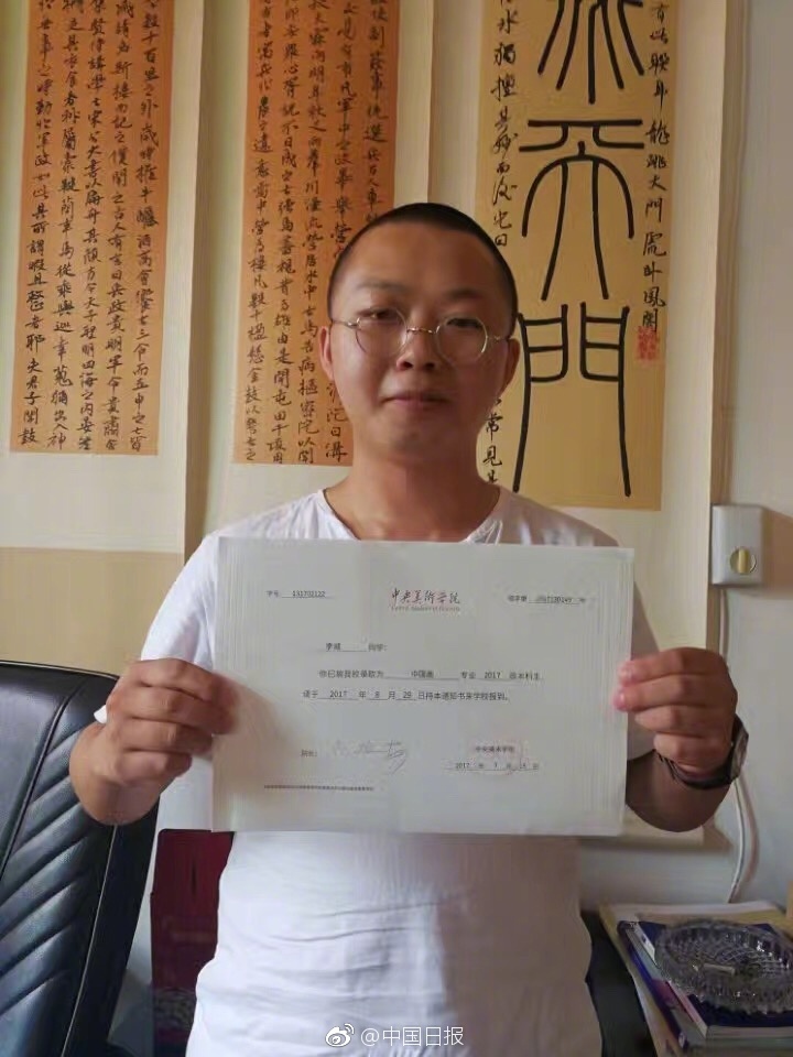 近日,在中央美院当了10年保安的李城,终于实现了梦想——被中央美院录取。今年28岁的李城,10年来半工半读,但都因文化成绩不足一直未能圆梦。去年,他选择进入一所正规学校系统学习文化课,今年高考以412分的成绩过线。此前,他以全国第八的成绩通过了央美的专业考试。李城想对所有怀抱梦想的人说:“一切困难都是纸老虎,只要坚定信念,就一定能实现我们的梦想!” 来源:@中国日报 李城想对所有怀抱梦想的人说:“一切困难都是纸老虎,只要坚定信念,就一定能实现我们的梦想!” 今年28岁的李城,10年来半工半读,但都因文化成绩不足一直未能圆梦。 近日,在中央美院当了10年保安的李城,终于实现了梦想——被中央美院录取。 李城想对所有怀抱梦想的人说:“一切困难都是纸老虎,只要坚定信念,就一定能实现我们的梦想!”