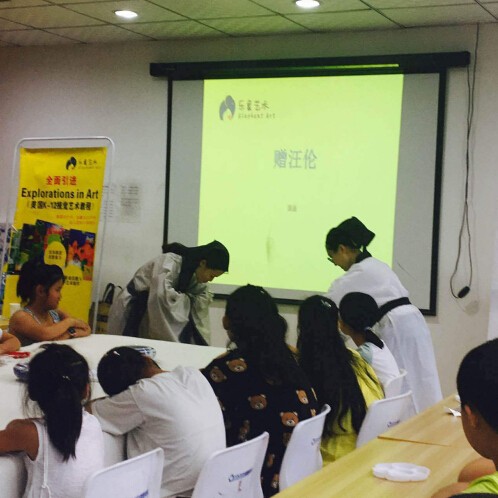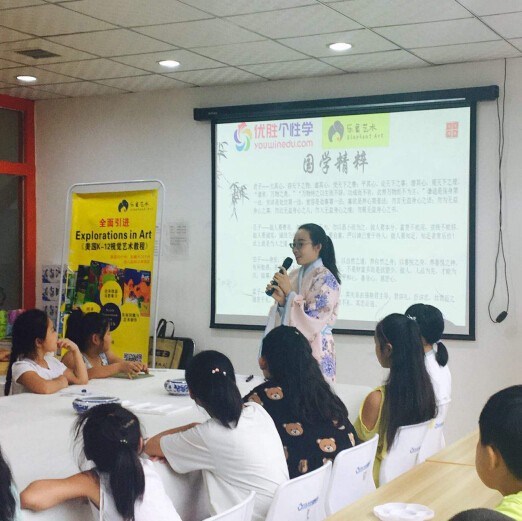 优胜教育(西安一中校区)携手乐象儿童艺术(玉祥门校区)2017年8月20日在优胜教育共同举办主题为“国学传承,品味经典”国学素质课活动。其中包含国学经典问答环节与乐象美术机构为各位孩子提供的书法、山水画教学,让孩子在学习国学文化的同时,体会中国古典文化的魅力,本次课程以诗、读画、 以画的完善理解诗意,以画的形式来展现诗的意境,同时让儿童以诗人的情感深入情境体会诗意,带给儿童诗一般的美术课堂。 在课堂上调动儿童看、听、触、想、闻五大感官,使儿童沉浸于诗意中,同时迸发出诗人的灵感,从而创作出独一无二的作品。本节课以国画的形式和语文范畴内的诗歌完美匹配。