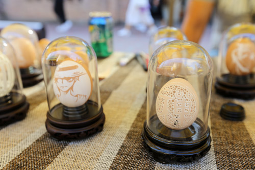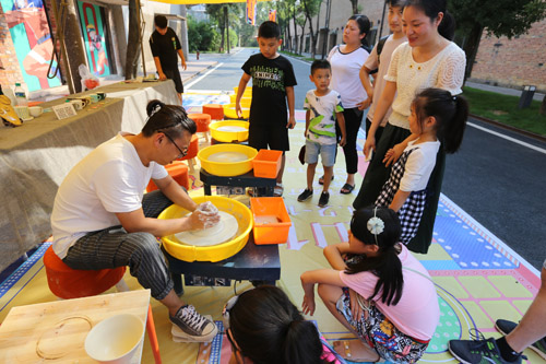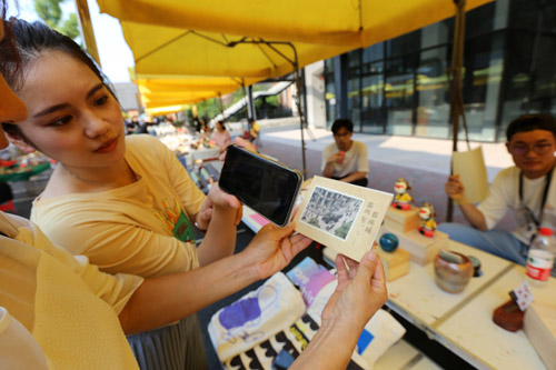 来自湖北美院学生制作的陶瓷月饼。(图片均由王东摄) 游客欣赏来自央美的绘本糖果书AR体验套装 一幅画有上世纪80年代小城的小画,用手机扫一扫,里面的人和车辆立刻动起来,并传来现场动感的声音,把观者带进旧时光,触摸发生在小城的故事。这是2日陶溪川春秋大集八大美院文创艺术精品展区,一个出自中央美院的文创作品——绘本糖果书AR体验套装,它一亮相就吸引了众多观众的目光,纷纷赞叹它的神奇。 本次八大美院与景德镇陶瓷大学等30所院校带来的文创作品,与以往不同,除了大量陶艺作品外,很多艺术精品,不同的艺术形式和作品相遇,别具一格的创意和思想在此碰撞。展览自2日开始至5日结束,镜头带你领略一个个指尖上的艺术精品。 绘本糖果书AR体验 陶瓷月饼 企鹅摆件 刻有凤凰的陶瓷月饼 鱼化石 来自西安美院的野生山楂陶瓷项链作品 永生花植物画 来自景德镇学院的蛋雕作品 一游客拍摄雕塑作品 精美茶具陶瓷作品 小朋友体验区