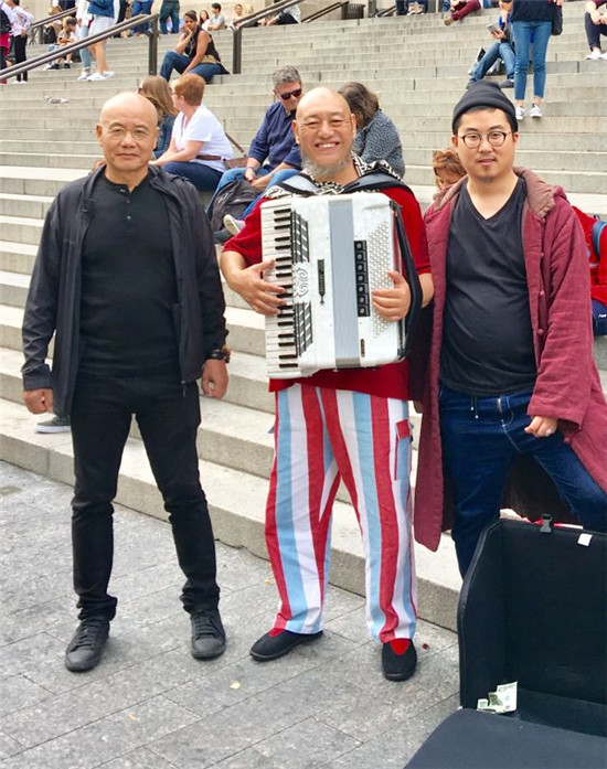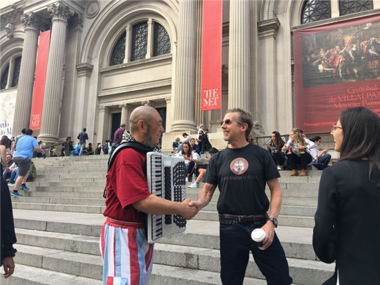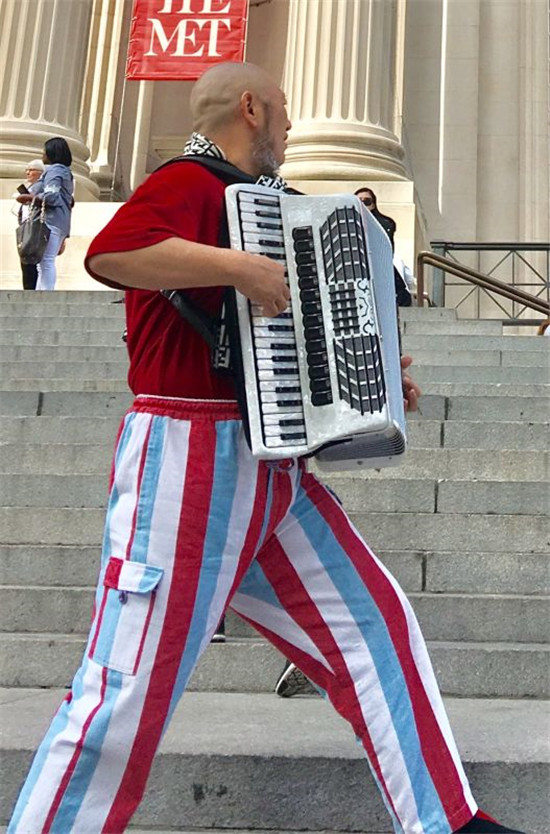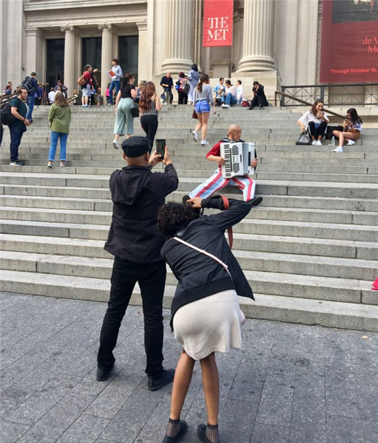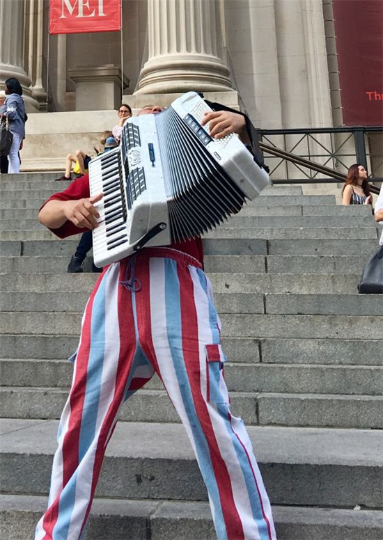 丁正耕在纽约曼哈顿大都会博物馆大门前行为艺术-拉手风琴四十分