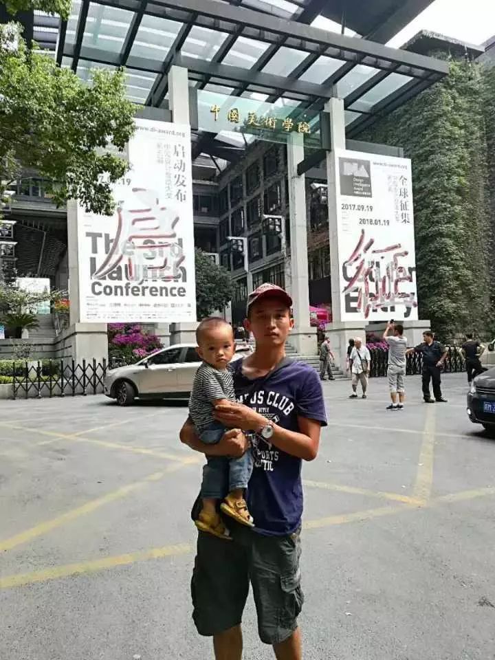 但是他的妻子和家人都支持他,终于如愿考上。报到那天,妻子给他和孩子在中国美院南山校区的大门前留下一张合影。