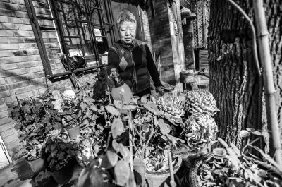 “这盆三个头的叫‘万山红遍’,那个绿色的叫‘绿安娜’,全开的这朵叫‘清水荷花’。这胡同里养的菊花,基本都是我给的。塑料袋里装的那两盆就是送人的,一会儿人就拿走。”樊阿姨拿着小喷壶一边喷水一边介绍,“我自打结婚就一直住这儿,一直喜欢养花。退休了有闲工夫了,养得更多。胡同里好些人都有这个爱好。”