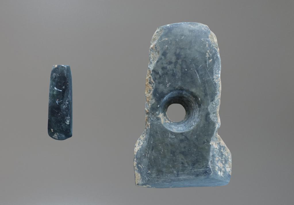 这是蒋刘遗址墓葬中出土的玉锛和穿孔石锛。(陕西省考古研究院供图)