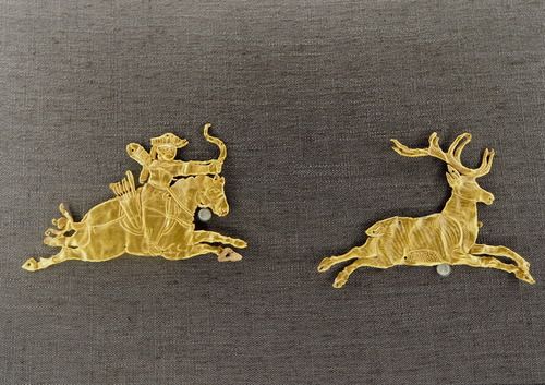 出土于青海都兰热水墓群的骑射形金饰片(2019年9月20日摄)。新华社记者 白玛央措 摄