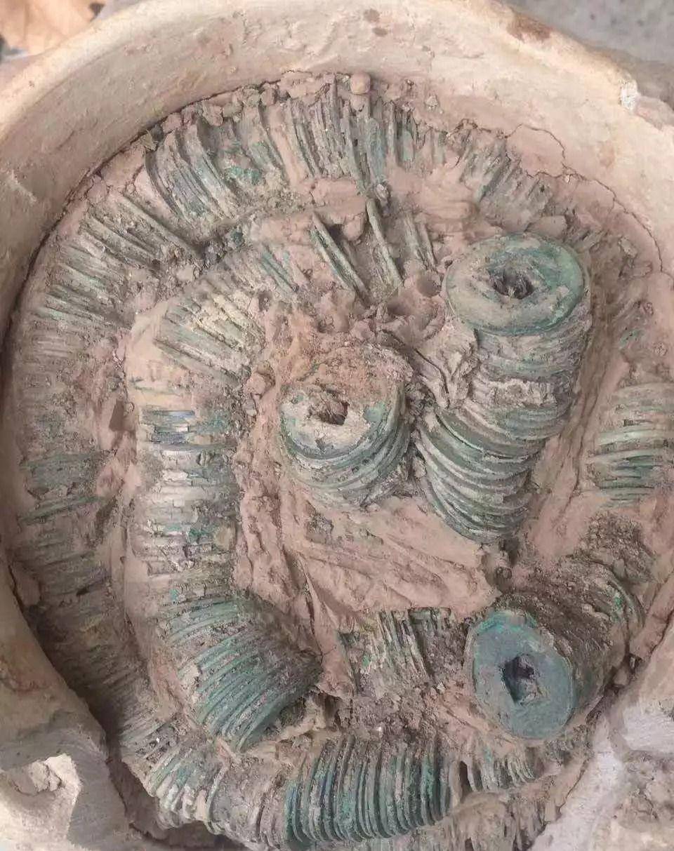 消息一传出,当地的文物保护部门立刻赶到现场,开始清理这批神秘的古钱。当他们揭开窖藏的土层时,眼前的景象简直让人惊掉了下巴:一个长方形的大窖,长6.85米,宽3米,深1.44米,里面满是铜钱。更令人吃惊的是,在这些铜钱中间,竟然摆放着两个黄釉双系执壶,东西相隔2.5米,壶嘴朝下倒置。