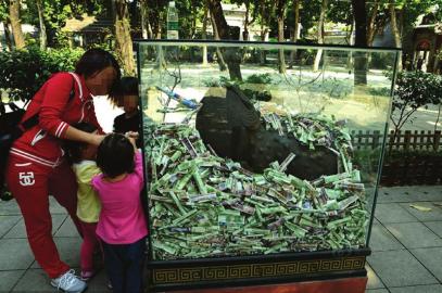 然而,四川博物院的展柜就没那么幸运。工作人员李江涛介绍,前两年曾有游客往展柜里塞钱,但近来少有这种不文明的行为。密封的展柜如何塞进纸币或硬币?李江涛说,有的玻璃展柜四周有缝隙,游客通过缝隙往里面塞钱,也有人把零钞卷起来从展柜上方的通气孔中塞进去。“本来没有塞钱的缝,塞钱的人多,缝隙越来越大。”