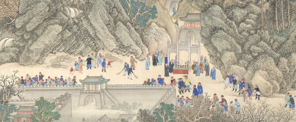 《康熙南巡图》是以康熙南巡为题材的大型历史图卷, 共十二卷, 总长213 米。在康熙二十八年(1689) 第二次南巡归来后开始的创作, 由康熙皇帝指派曹寅的弟弟曹荃监画。所绘人物万余个, 牛、马、犬、羊等牲畜数千, 江河山川、城池衙署应有尽有。画家在描绘时, 将康熙南巡所经过的地方和事情如实地表现出来, 另一方面又大量地反映了当时的一些风土人情、地方风貌及经济文化景象, 从侧面反映了当时的社会生活和人民的生产劳动。