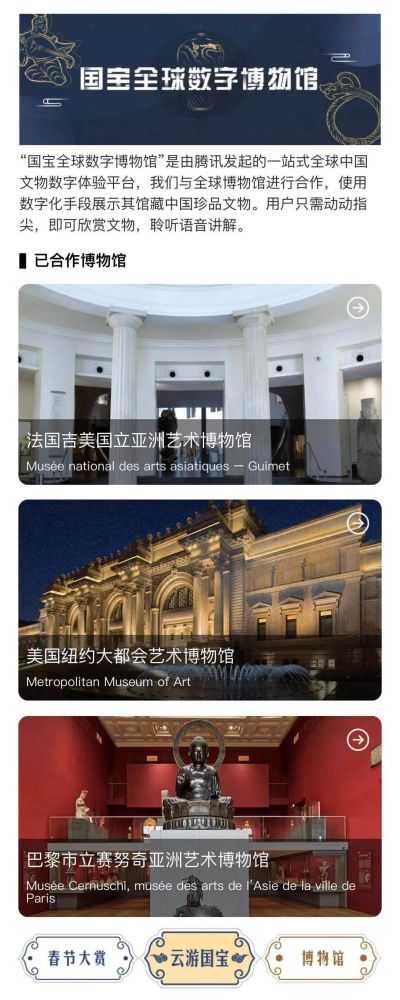 “国宝全球数字博物馆”由腾讯发起,与全球博物馆合作将海外馆藏中国珍品文物在数字化平台呈现,是为打造一站式全球国宝文物数字体验平台。